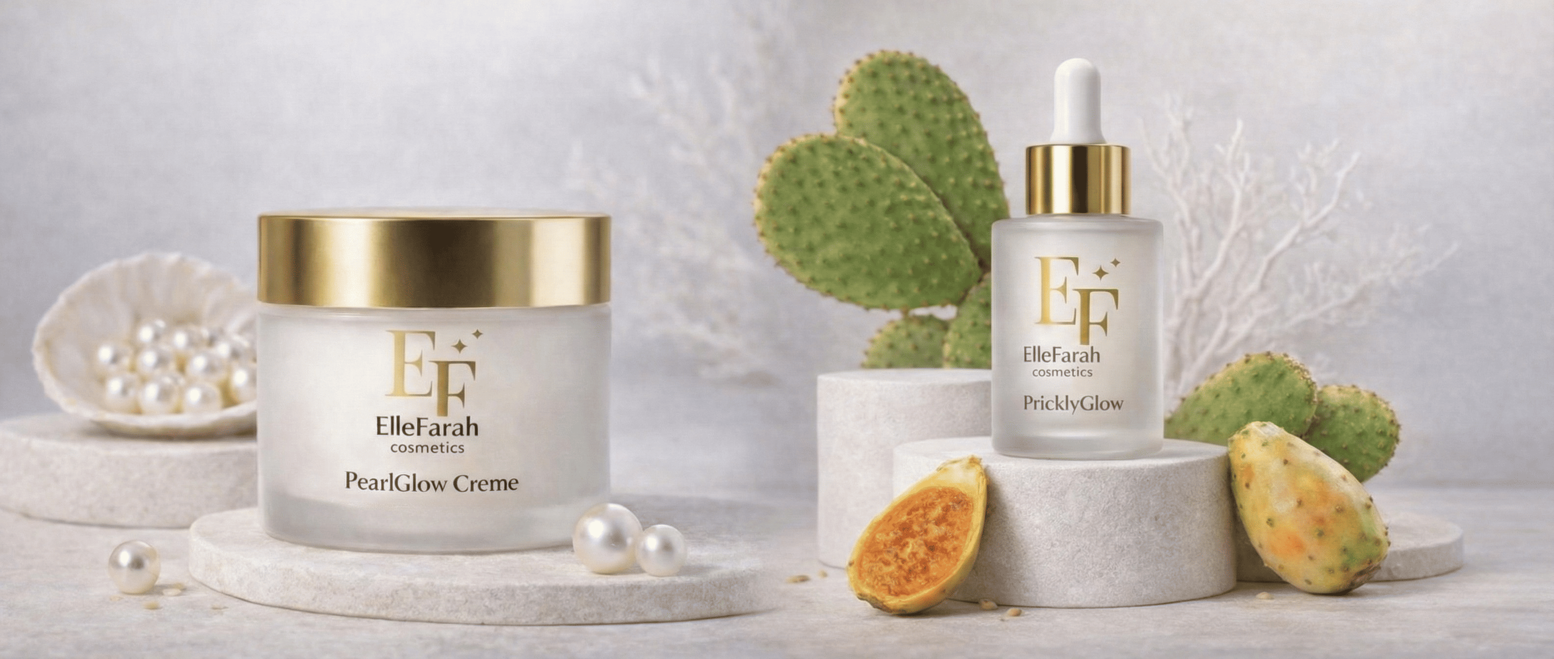 Das ElleFarah Wüstenzauber Bundle vereint die regenerierende Kraft des PricklyGlow Serums mit der tiefenwirksamen Feuchtigkeit der PearlGlow Creme. Gemeinsam sorgen sie für strahlende, geschützte Haut – jetzt zum exklusiven Vorzugspreis!